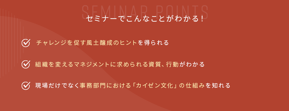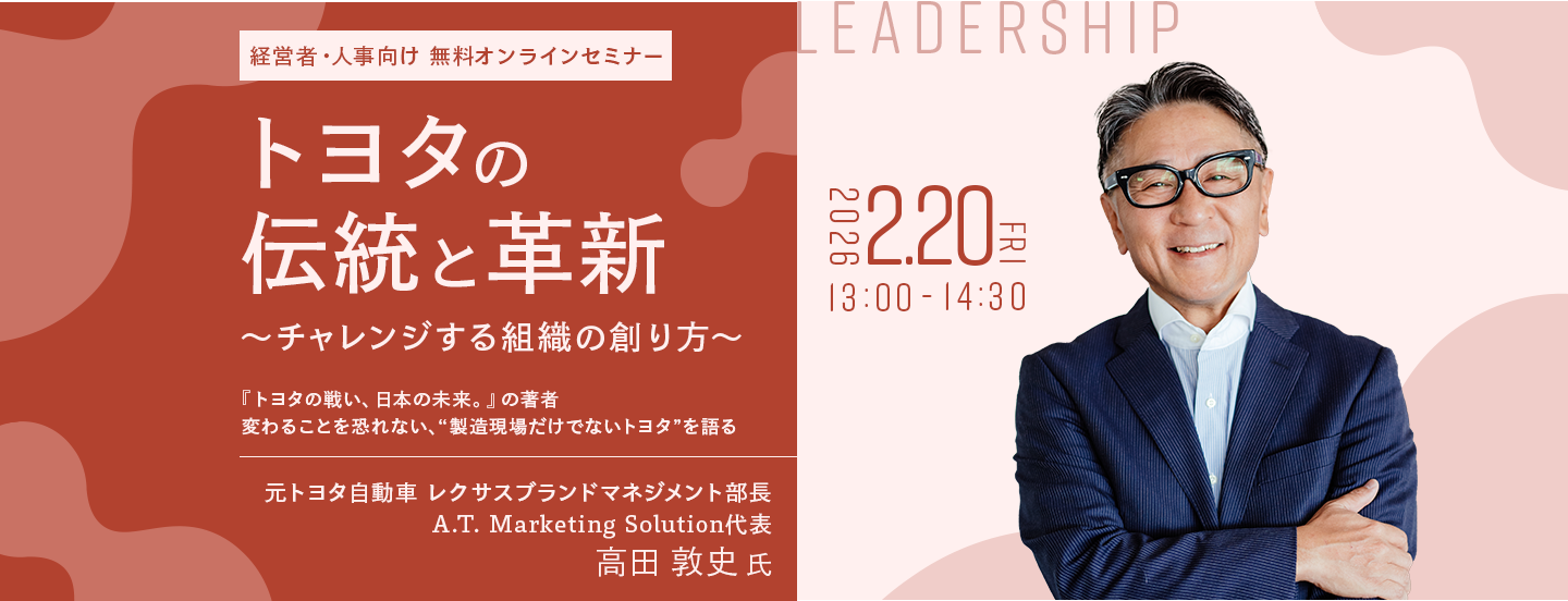 本セミナーは、組織風土改革・管理職育成・人材定着といった課題を抱える経営者・人事責任者・教育担当者の皆さまにとって、自社の課題を言語化し、施策の方向性を見いだす貴重な機会となるはずです。トヨタの事例を“かみ砕いて”学び、自社に活かすヒントを得たい方は、ぜひご参加ください。