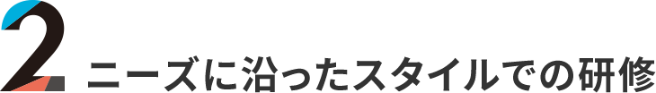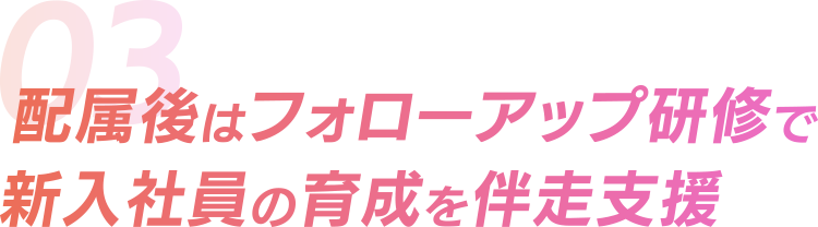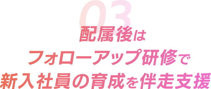 入社直後の研修で基礎知識を習得した後は、企業の特性にあわせたフォローアップ研修で、知識とスキルを網羅的に習得。新入社員の早期立ち上がりと定着に貢献します。